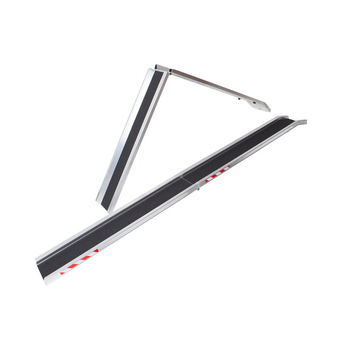 The pair of Aluminium rails with a length of 2 metres each serve the effortless loading of heavy and bulky payload. The running surface of the rails is non-slip coated in order to guarantee safe loading and to prevent slippage when wet.  The Aluminium loading rails have a protective edge which secures the load additionally. In the fold-able version, the rails are very simply transportable while taking up next to no space.