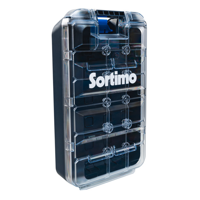 The empty T-BOXX 120 can be equipped as required depending on its intended use. There are no limits to how you choose to configure the box with the range of insetboxes, first aid or load securing kits and mySortimo inlay foam inserts.The Sortimo T-BOXX 120 is the compact new addition to the T-BOXX range, optimising the practical transport of smaller components. With its distinctive grid pattern and ‘crowns’ on the lid of the T-BOXX 320 and 330, it guarantees that insets boxes are efficiently secured in place and organised. The coupling feet on the base enable it to be practically joined to the lids of larger models, while a lock prevents it from accidentally coming loose. Whether they are transported individually or combined, they fit seamlessly into all Sortimo van racking systems. The Sortimo EcoSystem is at the heart of the T-BOXX 120: its fold-out ProClick hook means that it can be attached to SR5 and Globelyst4 van racking systems without the need for a tool. What is more, it is also compatible with all Sortimo ProClick products and the products of other partners, such as Bosch. The spring-loaded hook automatically springs back once a box has been removed, ensuring ease of handling.(Pictures are similar, decorative material not included; delivery only within UK and Ireland)